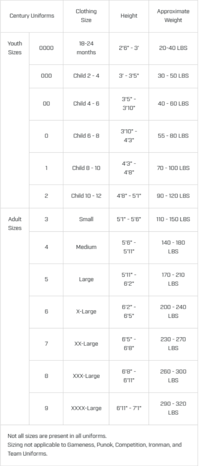This is a standard black karate uniform. We strongly recommend reviewing the size chart before ordering. We also suggest ordering the uniform slightly larger for children and rolling the sleeves and pants as the student.