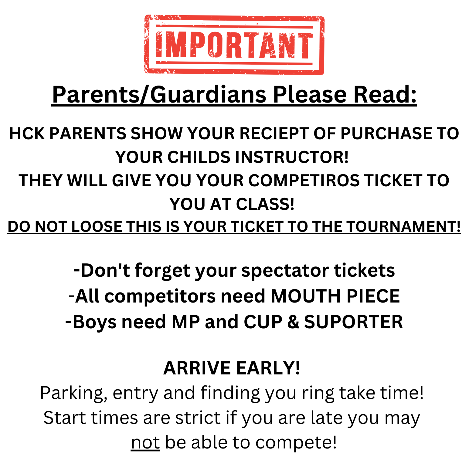 Don't forget your spectator tickets!! Mouth Piece (ALL Students) or Cup & Supporter (Boys Only)